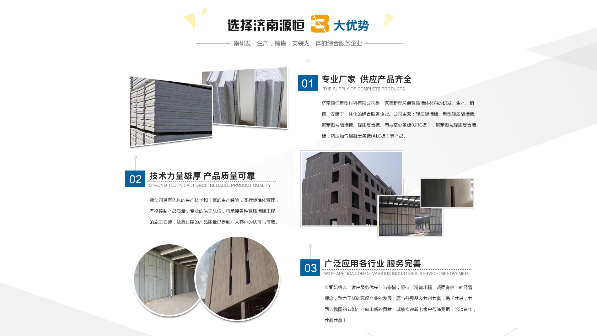 濟南源恒新型材料有限公司坐落于美麗的泉城濟南,是集新型環(huán)保輕質墻體材料的研發(fā)、生產、銷售、安裝于一體化的綜合服務企業(yè)。我公司具有的生產技術和豐富的生產經驗,為您提供輕質隔墻板、新型輕質隔墻板、聚苯顆粒隔墻板、輕質復合板、陶??招臈l板(GRC板),聚苯顆粒輕質復合墻板,蒸壓加氣混凝土條板(ALC板)等產品,本公司有專的施工隊伍,可承接各種輕質墻板工程的施工安裝。輕質隔墻板是國家推廣使用的新型輕質、綠色無害建材,是墻改節(jié)能政策大力扶持的環(huán)保節(jié)能產品,是發(fā)達國家普遍采用的新型墻體材料。濟南源恒新型材料有限公司實行標準化管理,嚴格控制產品質量,依靠過硬的產品質量已得到廣大客戶的認可與信賴。公司產品遍布各大城市,與國內多家客戶建立了良好的合作關系。公司始終以“客戶服務優(yōu)先”為宗旨,堅持“精益求精、誠而有信”的經營理念,致力于低碳環(huán)保產業(yè)的發(fā)展,愿與各界朋友共創(chuàng)共贏,攜手共進,共同為我國的節(jié)能產業(yè)做出新的...